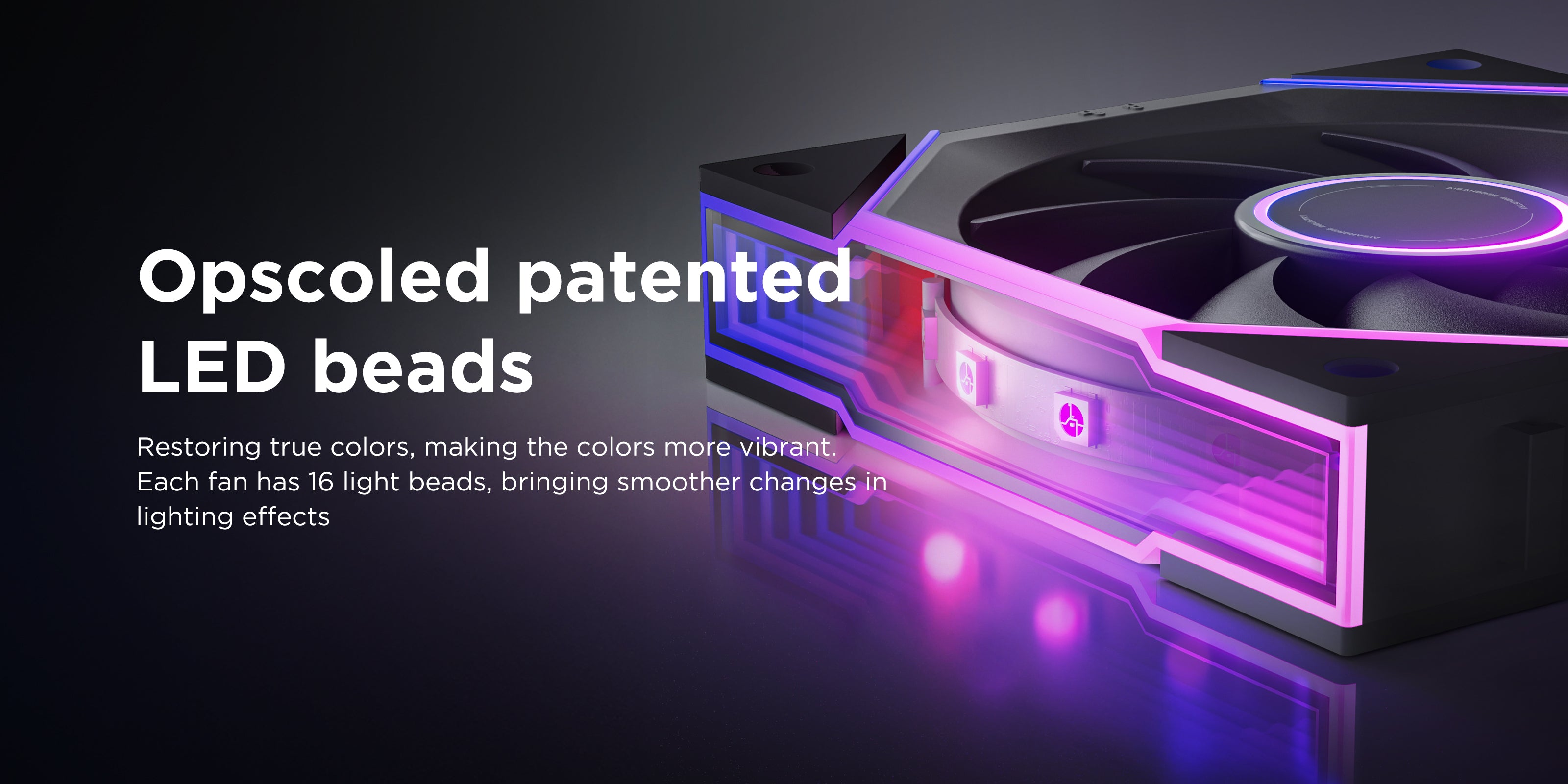 【Vivid Lighting with Patented LED Beads】:Each fan has 16 built-in Opscoled patented LED beads, which offer high color reproduction and present rich, realistic light effects. The light transitions smoothly and naturally, and can be adjusted synchronously via motherboard software. Whether it's a quiet single color or dynamic light effects, it can add rich visual layers to your PC.